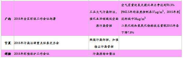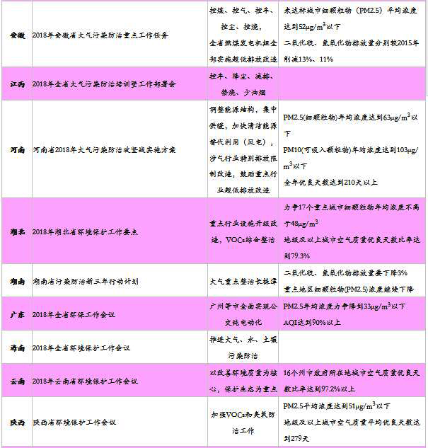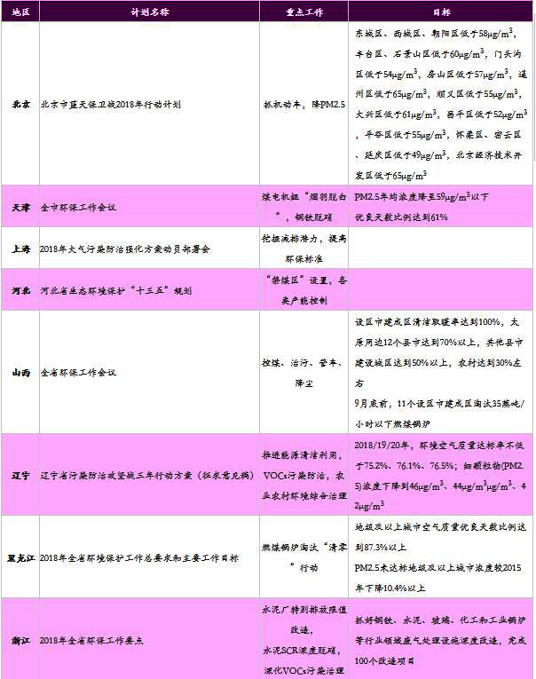 各省市陸續(xù)發(fā)布2018年大氣污染防治工作計(jì)劃,比如北京的“北京市藍(lán)天保衛(wèi)戰(zhàn)2018年行動(dòng)計(jì)劃”等,具體內(nèi)容整理如下表:
