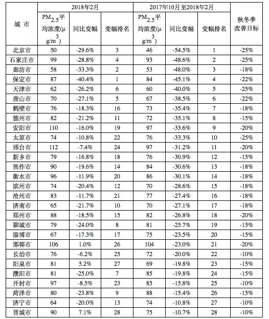 《通報》對“2+26”城市2017年10月至2018年2月細顆粒物(PM2.5)平均濃度和同比變化幅度分別進行排名。