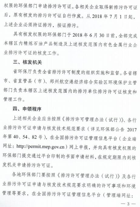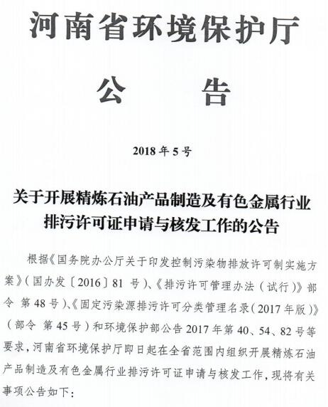 日前河南印發(fā)了《關(guān)于開(kāi)展精煉石油產(chǎn)品制造及有色金屬行業(yè)排污許可證申請(qǐng)與核發(fā)工作的公告》,鄭州市日前下發(fā)通知,開(kāi)展精煉石油產(chǎn)品制造及有色金屬行業(yè)排污許可證申請(qǐng)與核發(fā)工作,詳情如下: