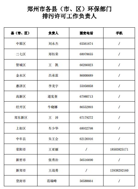 附件2: 鄭州市各縣(市、區(qū))環(huán)保部門排污許可證負(fù)責(zé)同志及聯(lián)系方式