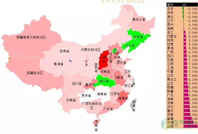從圖中看,除了黑龍江、海南、安徽、廣西、江西、山西與廣東的M2.5濃度同比上升外,其余省(市)2017年P(guān)M2.5濃度皆同比下降。