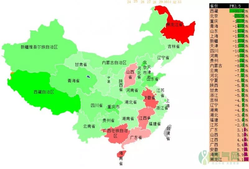 2017年全國(guó)各省PM2.5濃度同比變化率