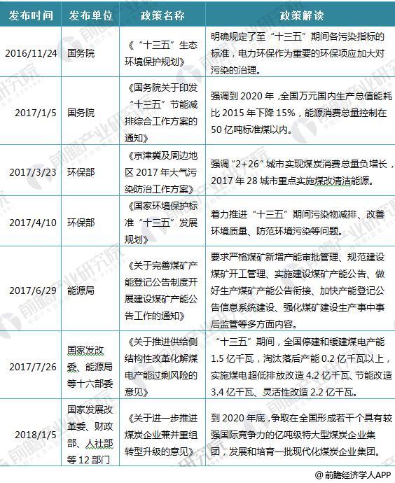 近年來,國家頻頻針對環(huán)境保護出臺相關(guān)的政策方案,針對煤炭發(fā)電產(chǎn)生的污染問題也增加了較大力度的政策約束。2016年11月24日,國務院出臺《“十三五”生態(tài)環(huán)境保護規(guī)劃》明確了“十三五”期間電力環(huán)保作應為重要的環(huán)保項應加大對污染的治理。隨后相關(guān)部門也出阿泰了煤炭發(fā)電及減排、防范和清潔能源利用的相關(guān)政策。一些列政策的實施為我國煤炭電力的改造等工程提供了方向支持,同時為電力環(huán)保行業(yè)的發(fā)展提供了政策保障。