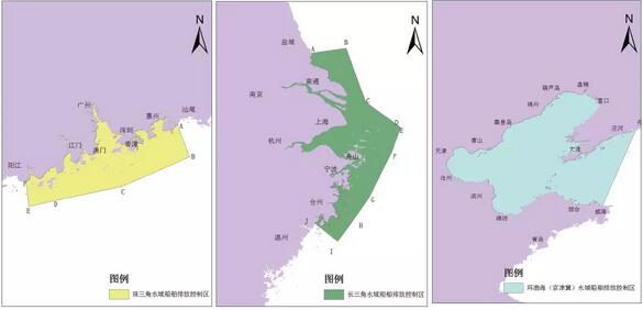 珠三角、長三角、環(huán)渤海(京津冀)水域船舶排放控制區(qū)區(qū)域如圖所示: