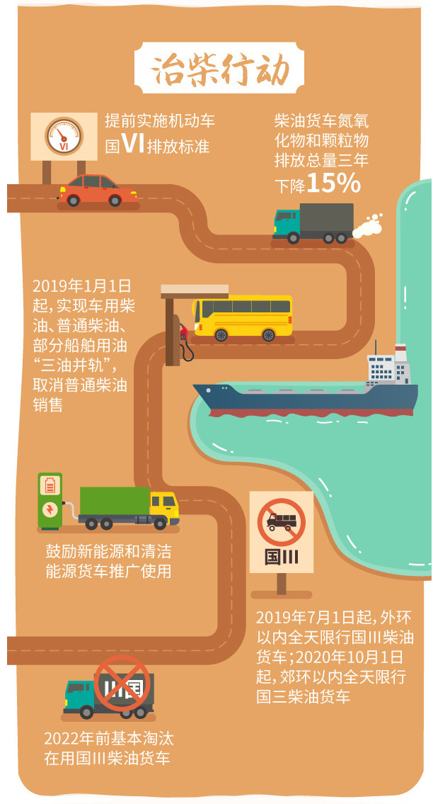 “治柴行動(dòng)”聚焦柴油貨車污染治理,堅(jiān)持源頭控制與末端治理相結(jié)合、鼓勵(lì)淘汰與強(qiáng)制限行相結(jié)合、本市治理與區(qū)域聯(lián)動(dòng)相結(jié)合,建成柴油貨車遠(yuǎn)程在線監(jiān)控系統(tǒng),進(jìn)一步加強(qiáng)日常監(jiān)管和部門聯(lián)動(dòng)。到2020年,柴油貨車氮氧化物和顆粒物排放總量比2017年下降15%。