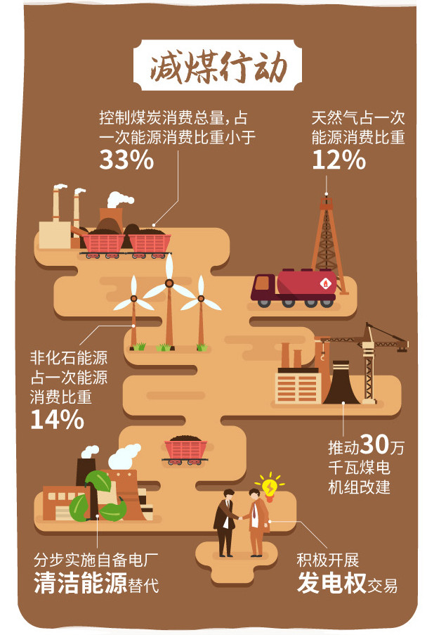 “減煤行動(dòng)”聚焦煤炭消費(fèi)總量控制,進(jìn)一步削減鋼鐵、石化行業(yè)用煤總量,控制發(fā)電行業(yè)煤炭總量,穩(wěn)定增加外來電供應(yīng)比例和非化石能源消費(fèi)比重。到2020年,煤炭消費(fèi)總量比2015年下降5%以上,煤炭占一次能源消費(fèi)比重下降到33%以下。