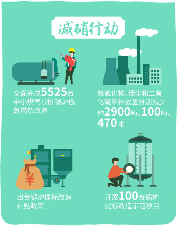 “減硝行動(dòng)”聚焦中小燃?xì)猓ㄓ停╁仩t提標(biāo)改造,通過政策引導(dǎo)、標(biāo)準(zhǔn)引領(lǐng)、執(zhí)法推動(dòng)、示范先行等措施,確保到2020年9月底完成5525臺(tái)中小燃?xì)猓ㄓ停╁仩t低氮燃燒治理改造。