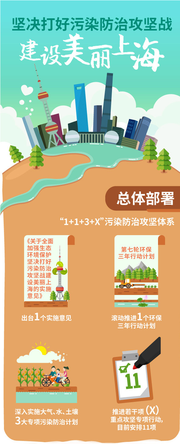 為貫徹落實(shí)習(xí)近平生態(tài)文明思想和全國(guó)生態(tài)環(huán)境保護(hù)大會(huì)精神,堅(jiān)決打好污染防治攻堅(jiān)戰(zhàn),市委、市政府按照“1+1+3+X”體系對(duì)本市污染防治攻堅(jiān)進(jìn)行了全面部署。第一個(gè)“1”是指制定1個(gè)總綱,即印發(fā)《中共上海市委上海市人民政府關(guān)于全面加強(qiáng)生態(tài)環(huán)境保護(hù)堅(jiān)決打好污染防治攻堅(jiān)戰(zhàn)建設(shè)美麗上海的實(shí)施意見》;第二個(gè)“1”是推進(jìn)1個(gè)綜合性環(huán)保計(jì)劃,即滾動(dòng)實(shí)施本市環(huán)保三年行動(dòng)計(jì)劃;“3”是指繼續(xù)推進(jìn)大氣、水、土壤等三個(gè)污染防治專項(xiàng)計(jì)劃。“X”是指對(duì)應(yīng)中央污染防治攻堅(jiān)要求,結(jié)合上海實(shí)際,對(duì)三年內(nèi)必須取得明顯進(jìn)展、環(huán)境改善貢獻(xiàn)較大的具體任務(wù)重點(diǎn)突破,出臺(tái)11個(gè)專項(xiàng)行動(dòng)。
