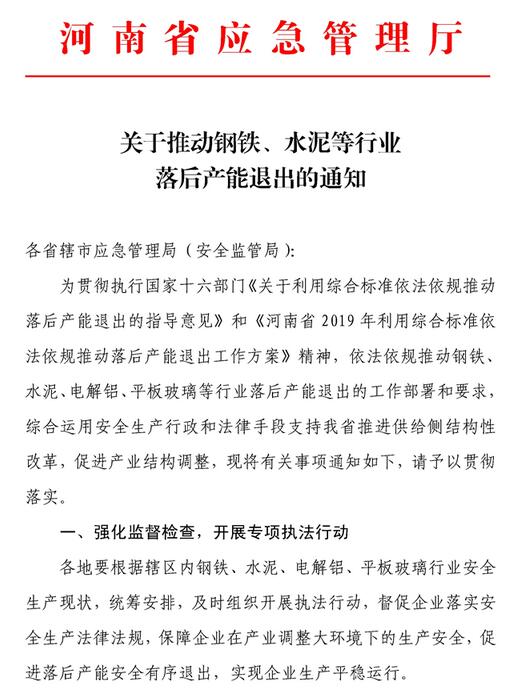 河南省應(yīng)急管理廳下發(fā)《關(guān)于推動鋼鐵、水泥等行業(yè)落后產(chǎn)能退出的通知》?!锻ㄖ访鞔_表示將利用安全生產(chǎn)行政和法律手段推進(jìn)水泥、鋼鐵等行業(yè)落后產(chǎn)能退出?!锻ㄖ芬蟾骷墤?yīng)急管理部門要加大執(zhí)法檢查力度,對安全生產(chǎn)條件達(dá)不到相關(guān)法律、行政法規(guī)和國家標(biāo)準(zhǔn)或行業(yè)標(biāo)準(zhǔn)要求的產(chǎn)能,及存在《工貿(mào)行業(yè)重大生產(chǎn)安全事故隱患判定標(biāo)準(zhǔn)(2017版)》規(guī)定的重大隱患,經(jīng)治理仍然不到位的企業(yè),立即停業(yè)停產(chǎn)整頓;經(jīng)停業(yè)停產(chǎn)整頓仍不具備安全生產(chǎn)條件的提請地方人民政府予以關(guān)閉。