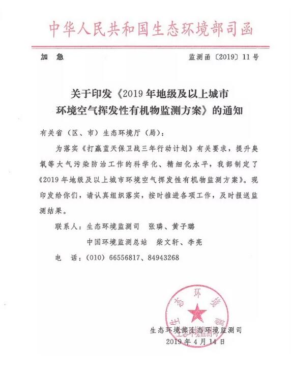 環(huán)境部 :《2019年地級(jí)及以上城市環(huán)境空氣揮發(fā)性有機(jī)物監(jiān)測(cè)方案》