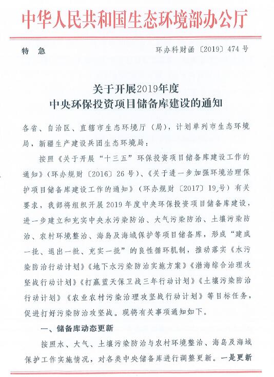 生態(tài)環(huán)境部辦公廳關(guān)于開展2019年度中央環(huán)保投資項(xiàng)目儲備庫建設(shè)的緊急通知