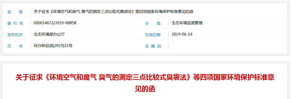 2019年6月14日,生態(tài)環(huán)境部發(fā)布關(guān)于征求《環(huán)境空氣和廢氣 臭氣的測定三點(diǎn)比較式臭袋法》等四項(xiàng)國家環(huán)境保護(hù)標(biāo)準(zhǔn)意見的函,詳情如下: