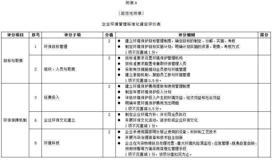 企業(yè)應(yīng)當(dāng)依據(jù)本標(biāo)準(zhǔn)附錄A評價表,自行或委托第三方對本企業(yè)開展環(huán)境管理標(biāo)準(zhǔn)化建設(shè)情況進行評價,并確定相應(yīng)的環(huán)境管理標(biāo)準(zhǔn)化建設(shè)等級。