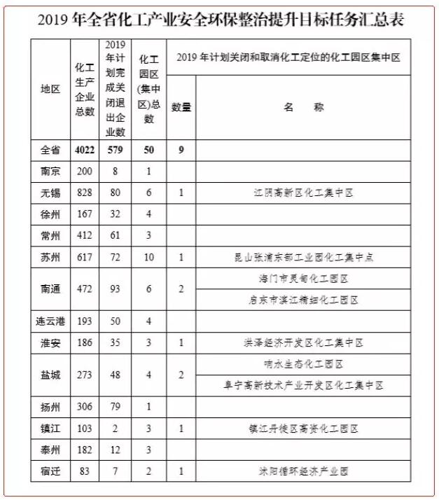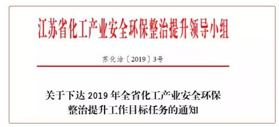 江蘇省化工產(chǎn)業(yè)安全環(huán)保整治提升領(lǐng)導(dǎo)小組,下發(fā)一則關(guān)于下達(dá)2019年全省化工產(chǎn)業(yè)安全環(huán)保整治提升工作目標(biāo)任務(wù)的通知。