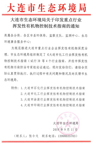 大連發(fā)布《關(guān)于印發(fā)重點行業(yè)揮發(fā)性有機物控制技術(shù)指南的通知》,全文如下: