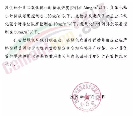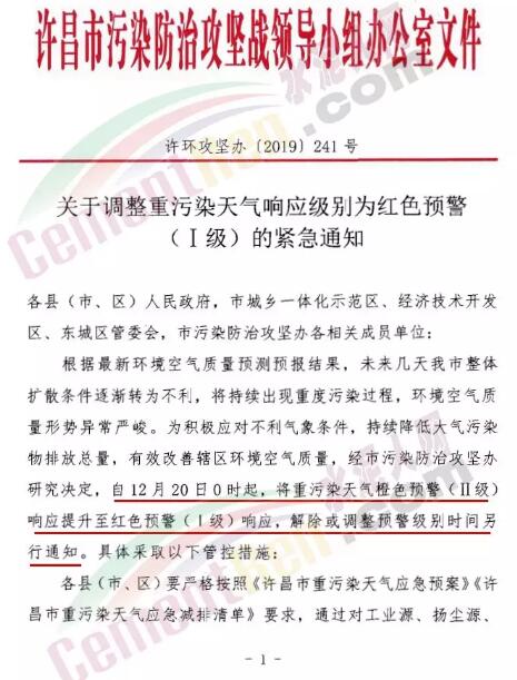 河南省許昌市污染防治攻堅戰(zhàn)領(lǐng)導(dǎo)小組辦公室發(fā)布了《關(guān)于調(diào)整重污染天氣響應(yīng)級別為紅色預(yù)警(I級)的緊急通知》稱,根據(jù)最新環(huán)境空氣質(zhì)量預(yù)測預(yù)報結(jié)果,未來幾天許昌市整體擴散條件逐漸轉(zhuǎn)為不利,將持續(xù)出現(xiàn)重度污染過程,經(jīng)是污染防治攻堅辦研究決定,自12月20日0時起,將重污染天氣橙色預(yù)警(II級)響應(yīng)提升至紅色預(yù)警(I級)響應(yīng),解除時間另行通知。文件如下: