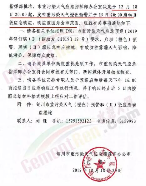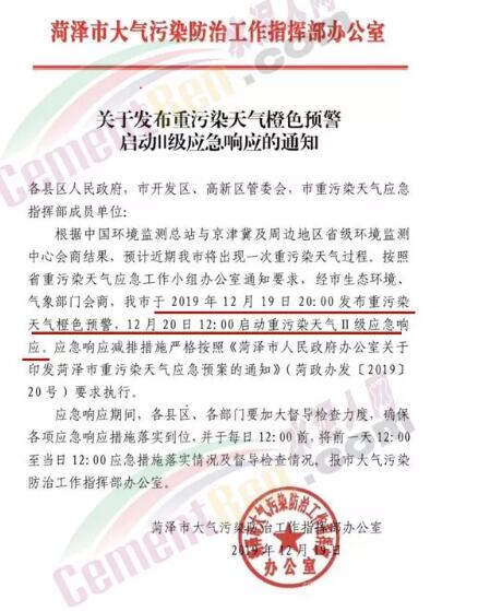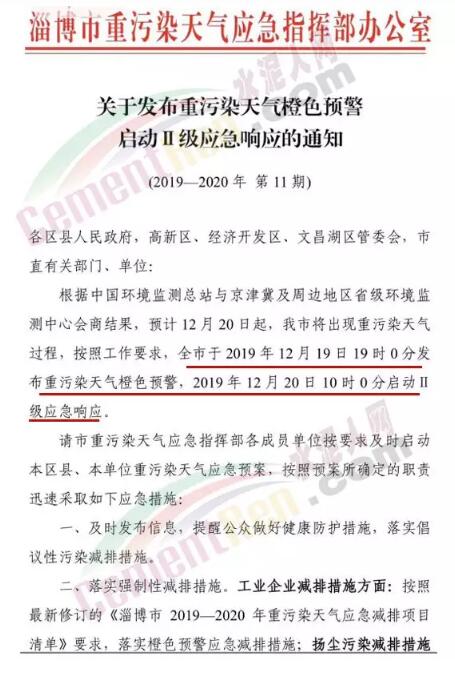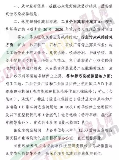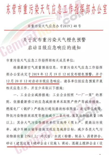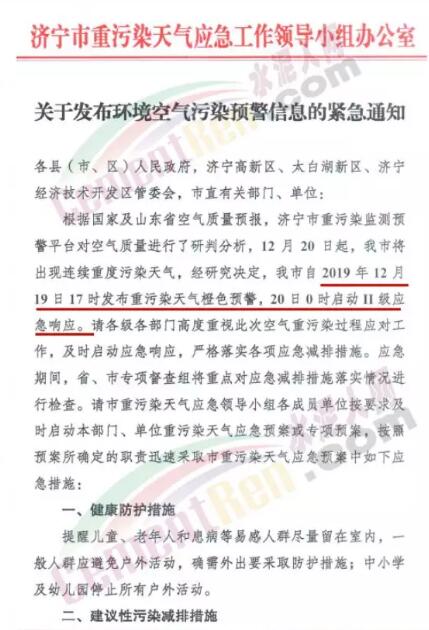 12月19日,山東省東營市重污染天氣應(yīng)急指揮部辦公室發(fā)布了《關(guān)于重污染天氣橙色預(yù)警啟動II級應(yīng)急響應(yīng)的通知》稱,根據(jù)最新空氣質(zhì)量預(yù)報信息,市重污染天氣應(yīng)急工作指揮部辦公室決定于2019年12月19日12時發(fā)布橙色預(yù)警,并于12月20日12時啟動II級應(yīng)急響應(yīng)。具體如下: