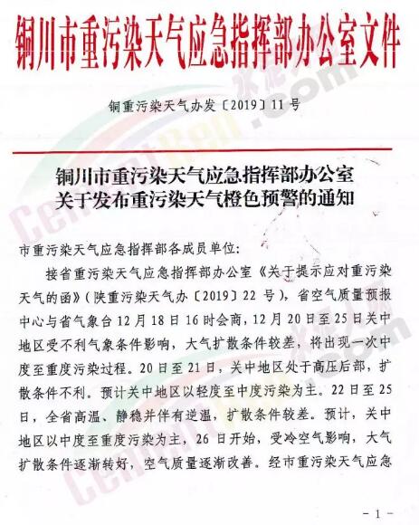 根據(jù)《陜西省重污染天氣應(yīng)急指揮部辦公室關(guān)于提示應(yīng)對重污染天氣的函》(陜重污染天氣辦發(fā)〔2019〕22號),12月20日至25日,受不利氣象條件影響,大氣擴散條件逐漸轉(zhuǎn)差,關(guān)中地區(qū)將出現(xiàn)一次中度至重度污染過程,我市可能出現(xiàn)連續(xù)2-4天重度污染。為保護公眾健康,降低大氣污染強度,按照《渭南市重污染天氣應(yīng)急預(yù)案》(渭政發(fā)〔2019〕34號)要求,市重污染天氣應(yīng)急指揮部決定于12月18日20:00時發(fā)布我市重污染天氣橙色預(yù)警,12月19日20:00時啟動Ⅱ級應(yīng)急響應(yīng),由各縣市區(qū)政府(管委會)和市級相關(guān)部門,組織實施以下應(yīng)急措施: