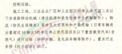 (2)移動源減排措施。停止使用國四及以下重型載貨汽車(含燃?xì)猓┻M行運輸(特種車輛、?;奋囕v、民生保障類等除外),和國二及以下非道路移動機械(清潔能源和緊急檢修作業(yè)機械除外)。