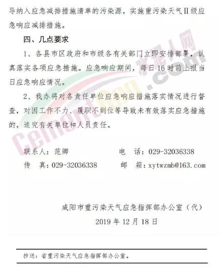 陜西省重污染天氣應(yīng)急指揮部辦公室發(fā)函請西安、寶雞、咸陽、銅川、渭南市,楊凌示范區(qū)、西咸新區(qū)、韓城市于12月18日20:00時發(fā)布橙色預(yù)警,并于19日20:00時前盡早啟動Ⅱ級應(yīng)急響應(yīng);要求各市(區(qū))持續(xù)加大執(zhí)法檢查力度,并按照各地新修訂的重污染天氣應(yīng)急減排清單,督促落實各項應(yīng)急減排措施,緩解重污染天氣影響。