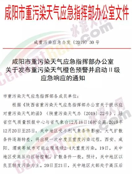 為保護公眾健康,降低大氣污染強度,根據(jù)《陜西省重污染天氣應(yīng)急指揮部辦公室關(guān)于提示應(yīng)對重污染天氣的函》(陜重污染天氣辦〔2019〕22號)的要求,按照《西安市重污染天氣應(yīng)急預(yù)案(2019年修訂稿)》規(guī)定,指揮部辦公室決定于2019年12月18日20時發(fā)布重污染天氣橙色預(yù)警信息,從2019年12月19日18時起啟動Ⅱ級應(yīng)急響應(yīng)。各區(qū)(縣)政府、開發(fā)區(qū)管委會和市級相關(guān)部門組織落實以下措施: