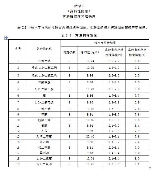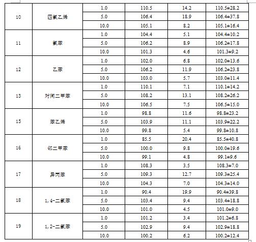 實驗室對含19種目標(biāo)化合物濃度為10mg/L的統(tǒng)一樣品進(jìn)行了6次重復(fù)測定:實驗室內(nèi)的相對標(biāo)準(zhǔn)偏差為1.3%~9.9%,實驗室間的相對標(biāo)準(zhǔn)偏差為5.5%~8.3%。
