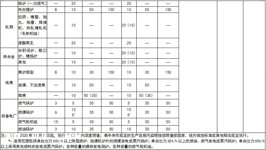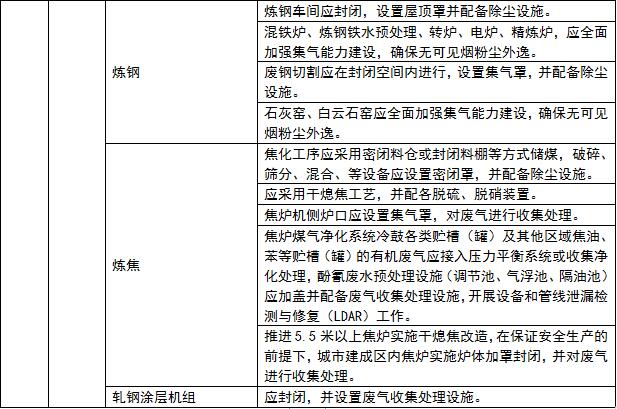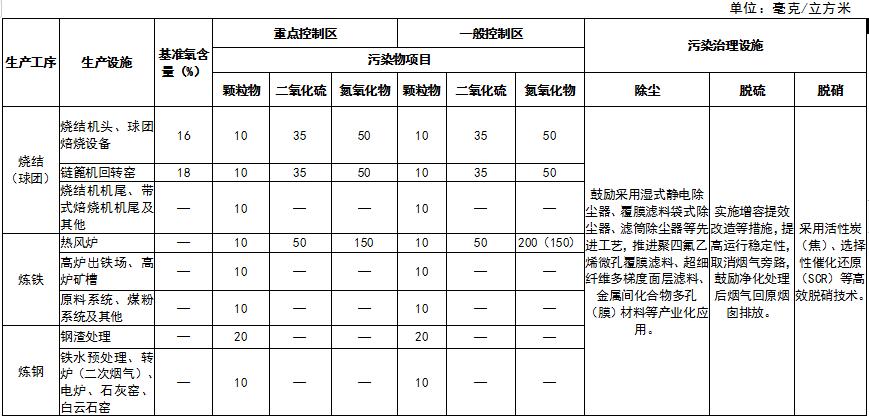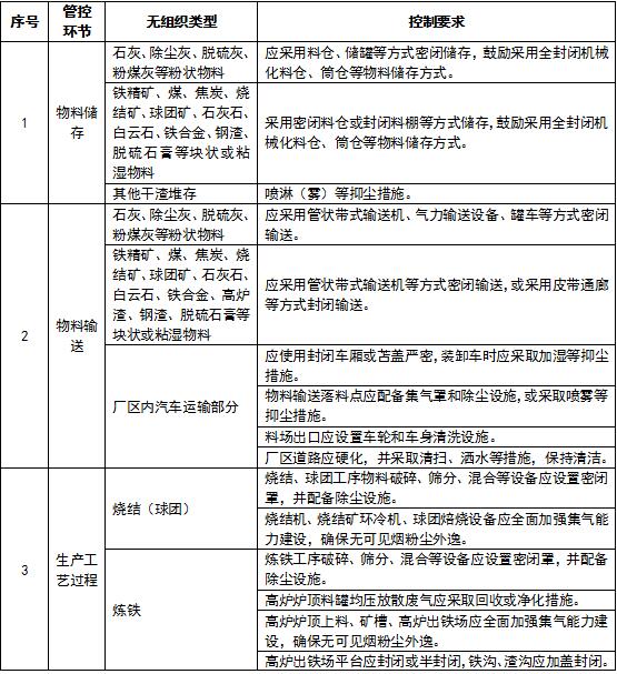 1.有組織污染排放控制要求。燒結(jié)機機頭、球團焙燒煙氣顆粒物、二氧化硫、氮氧化物排放濃度小時均值分別不高于10、35、50毫克/立方米;其他主要污染源顆粒物、二氧化硫、氮氧化物排放濃度小時均值分別不高于20、50、200毫克/立方米,具體指標限值及措施見附件1。