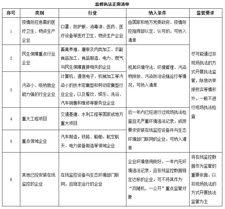 免除部分企業(yè)現(xiàn)場(chǎng)執(zhí)法檢查。對(duì)與疫情防控物資生產(chǎn)和民生保障密切相關(guān)的,污染排放量小、吸納就業(yè)能力強(qiáng)的,涉及重大工程和重點(diǎn)領(lǐng)域的管理規(guī)范、環(huán)境績(jī)效水平高的企業(yè),不進(jìn)行現(xiàn)場(chǎng)執(zhí)法檢查。