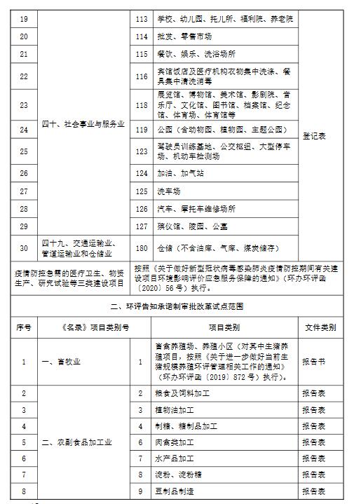 豁免部分項(xiàng)目環(huán)評(píng)手續(xù)辦理。繼續(xù)落實(shí)好已出臺(tái)的新冠肺炎疫情防控期間急需的醫(yī)療衛(wèi)生、物資生產(chǎn)、研究試驗(yàn)等三類建設(shè)項(xiàng)目環(huán)評(píng)應(yīng)急服務(wù)保障政策。加強(qiáng)與排污許可制銜接,對(duì)照《建設(shè)項(xiàng)目環(huán)境影響評(píng)價(jià)分類管理名錄》(以下簡(jiǎn)稱《名錄》),對(duì)關(guān)系民生且納入《固定污染源排污許可分類管理名錄(2019年版)》實(shí)施排污許可登記管理的相關(guān)行業(yè),以及社會(huì)事業(yè)與服務(wù)業(yè),不涉及有毒、有害及危險(xiǎn)品的倉(cāng)儲(chǔ)、物流配送業(yè)等10大類30小類行業(yè)的項(xiàng)目,不再填報(bào)環(huán)境影響登記表。