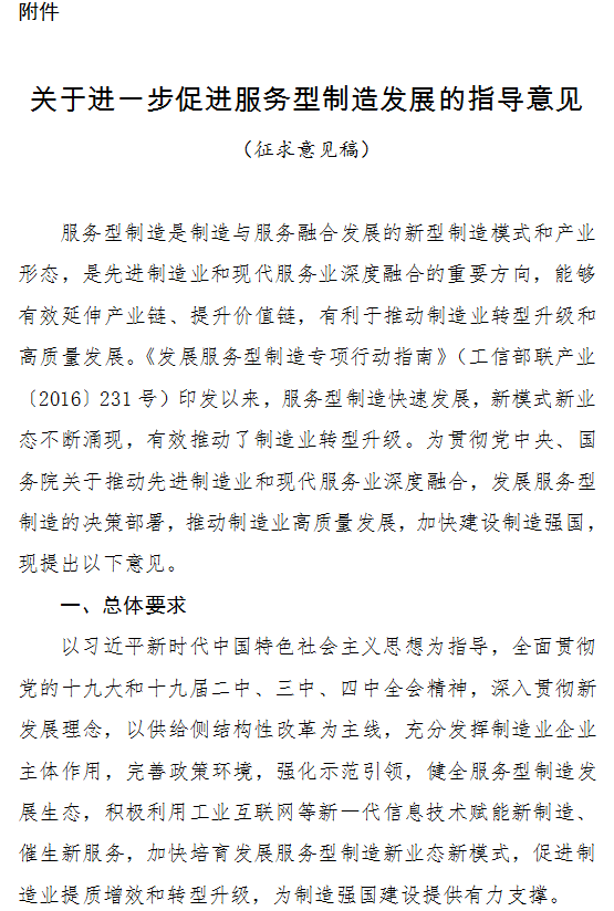 公開征求對《關(guān)于進(jìn)一步促進(jìn)服務(wù)型制造發(fā)展的指導(dǎo)意見》(征求意見稿)的意見