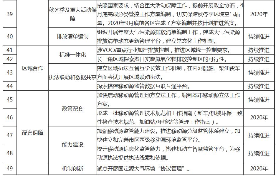 (2)開展秋冬季大氣污染綜合治理攻堅(jiān)行動(dòng)。按照國家要求,結(jié)合重大活動(dòng)保障工作,提前開展政企協(xié)商,4月底完成分類管控工作方案編制,切實(shí)保障秋冬季環(huán)境空氣質(zhì)量。2020年9月底前各區(qū)完成子方案編制并按計(jì)劃推進(jìn)落實(shí)。
