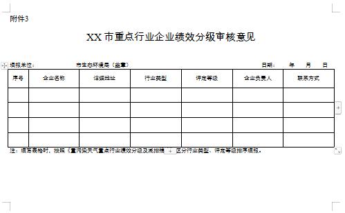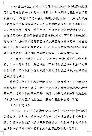(一)企業(yè)申報(bào)。企業(yè)按照《減排措施》《移動(dòng)源技術(shù)指南》規(guī)定進(jìn)行自評(píng)估和對(duì)標(biāo),編制《大氣污染防治績(jī)效評(píng)級(jí)申請(qǐng)報(bào)告》(見《規(guī)范》附件),將相關(guān)材料向當(dāng)?shù)乜h(市、區(qū))生態(tài)環(huán)境主管部門進(jìn)行申報(bào);申報(bào)績(jī)效分級(jí)為最低等級(jí)的,直接填寫《大氣污染防治績(jī)效評(píng)級(jí)申請(qǐng)表》(見《規(guī)范》附件)。