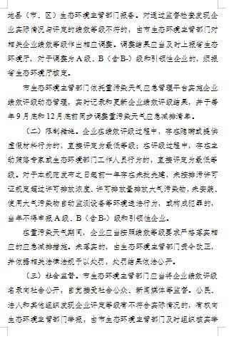 12月10日前,各市根據(jù)實(shí)際執(zhí)行情況和企業(yè)環(huán)???jī)效水平,開展一次績(jī)效分級(jí)動(dòng)態(tài)調(diào)整,將有關(guān)企業(yè)績(jī)效分級(jí)調(diào)整清單及申報(bào)材料上報(bào)省廳復(fù)核。