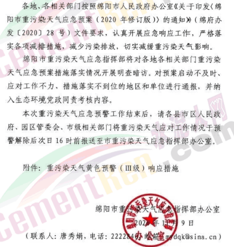 據(jù)水泥人網(wǎng)了解,綿陽市發(fā)布的《重污染天氣黃色預(yù)警(Ⅲ級)響應(yīng)措施》要求包括健康防護措施、倡議性污染減排措施和強制性污染減排措施。