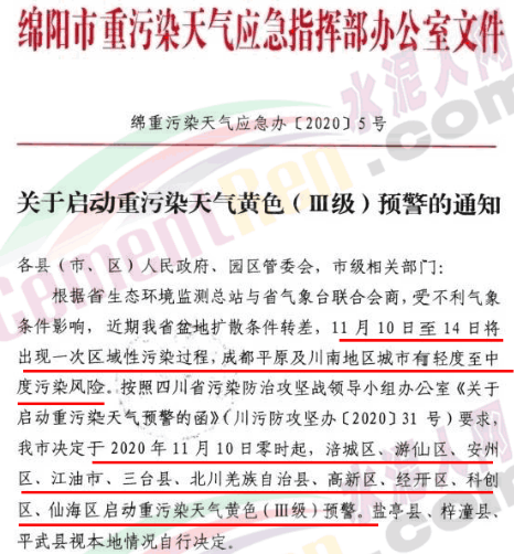 同日,四川綿陽發(fā)布《關(guān)于啟動重污染天氣黃色(Ⅲ級)預(yù)警的通知》稱,綿市于2020年11月10日零時起,涪城區(qū)、游仙區(qū)、安州區(qū)、江油市、三臺縣、北川羌族自治縣、高新區(qū)、經(jīng)開區(qū)、科創(chuàng)區(qū)、仙海區(qū)啟動重污染天氣黃色(Ⅲ級)預(yù)警。鹽亭縣、梓潼縣、平武縣視本地情況自行決定。