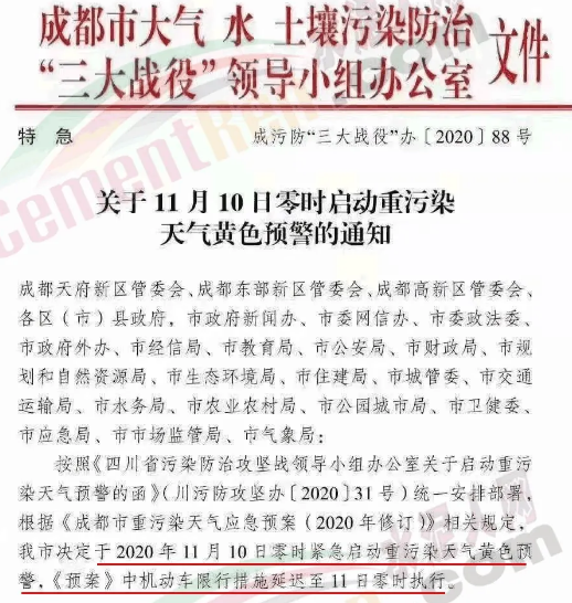 成都市大氣、水、土壤污染防治三大戰(zhàn)役"領(lǐng)導(dǎo)小組辦公室發(fā)布特急文件《關(guān)于11月10日零時啟動重污染天氣黃色預(yù)警的通知》(成污防"三大戰(zhàn)役"辦〔2020〕88號)稱,按照《四川省污染防治攻堅戰(zhàn)領(lǐng)導(dǎo)小組辦公室關(guān)于啟動重污染天氣預(yù)警的函》(川污防攻堅辦〔2020〕31號)統(tǒng)一安排部署,根據(jù)《成都市重污染天氣應(yīng)急預(yù)案(2020年修訂)》相關(guān)規(guī)定,成都市決定于2020年11月10日零時緊急啟動重污染天氣黃色預(yù)警,《預(yù)案》中機動車限行措施延遲至11日零時執(zhí)行。