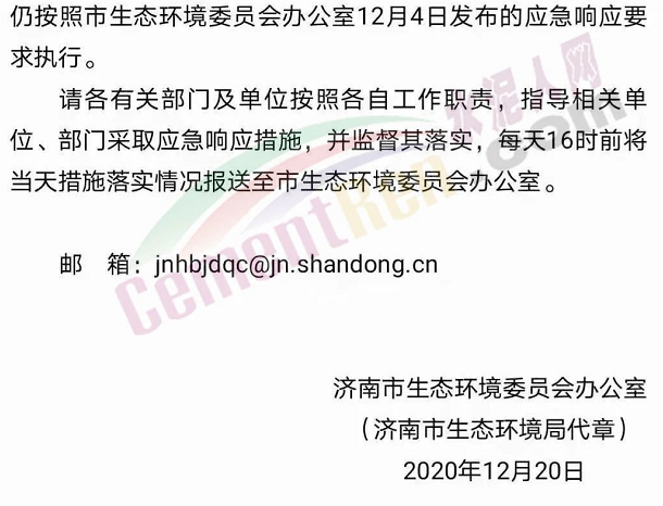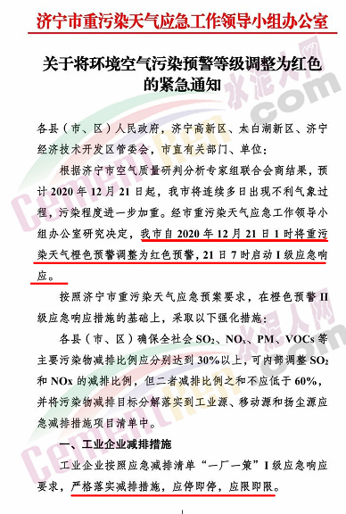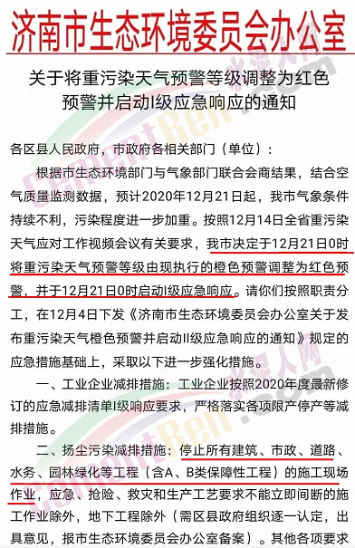 濟南市生態(tài)環(huán)境委員會辦公室通知自12月21日0時將重污染天氣預警等級由現(xiàn)執(zhí)行的橙色預警調(diào)整為紅色預警,并于12月21日0時啟動l級應急響應。工業(yè)企業(yè)按照2020年度最新修訂的應急減排清單I級響應要求,嚴格落實各項限產(chǎn)停產(chǎn)等減排措施。