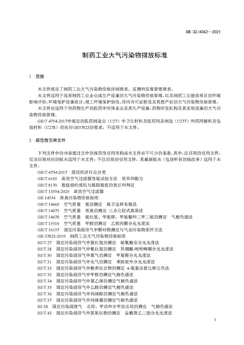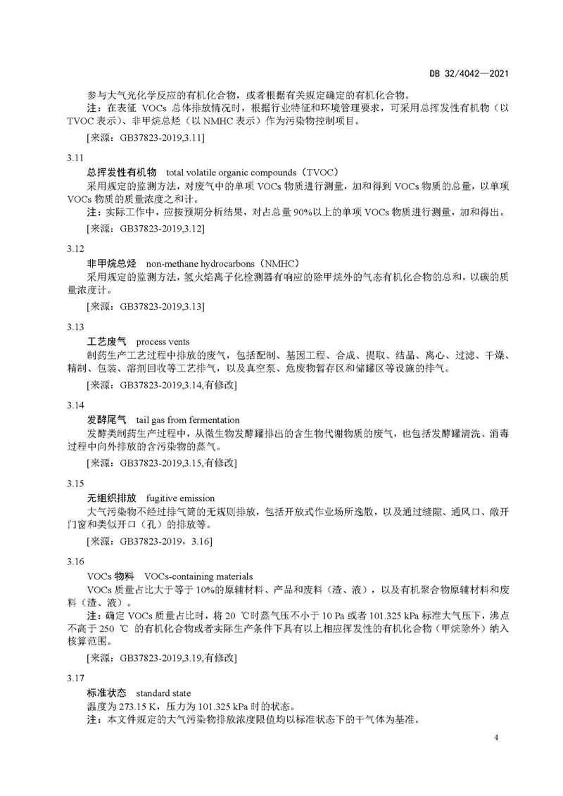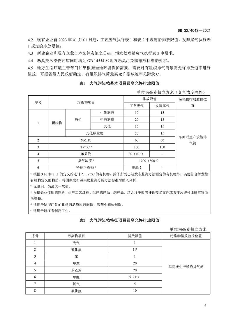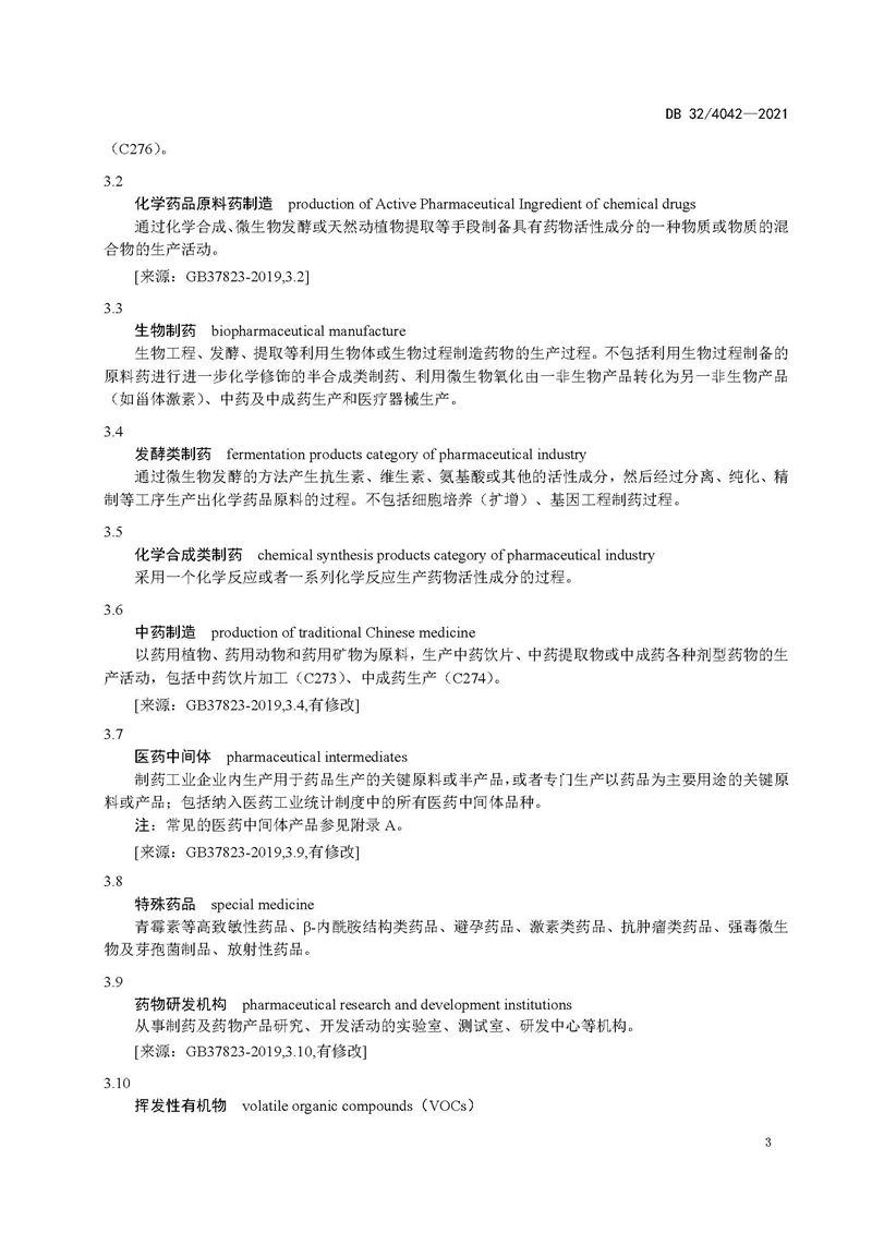 江蘇省地方標(biāo)準(zhǔn)《制藥工業(yè)大氣污染物排放標(biāo)準(zhǔn)》DB 32/4042—2021