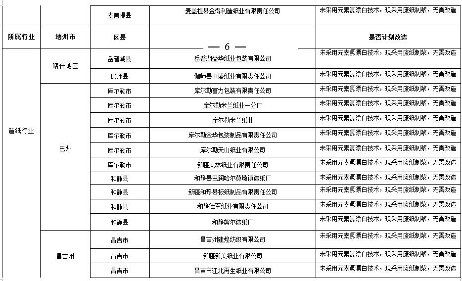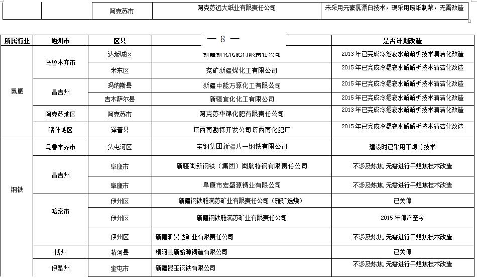 2017年底前,造紙行業(yè)完成紙漿無元素氯漂白改造或采取其他低污染制漿技術(shù),鋼鐵企業(yè)焦爐完成干熄焦技術(shù)改造,氮肥行業(yè)尿素生產(chǎn)完成工藝冷凝液水解解析技術(shù)改造,印染行業(yè)實施低排水染整工藝改造,制藥(抗生素、維生素)行業(yè)實施綠色酶法生產(chǎn)技術(shù)改造,制革行業(yè)實施鉻減量化和封閉循環(huán)利用技術(shù)改造。經(jīng)梳理統(tǒng)計這6大重點行業(yè)全區(qū)共有69家小型以上企業(yè),已完成清潔生產(chǎn)改造或不需改造的企業(yè)66家,2017年底前需完成改造的3家(見附件)。