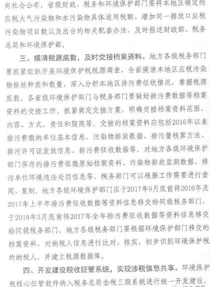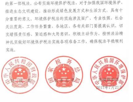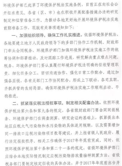 近日,財(cái)政部、稅務(wù)總局、環(huán)境保護(hù)部聯(lián)合下發(fā)通知,要求各地全面做好環(huán)境保護(hù)稅法實(shí)施準(zhǔn)備工作。此次通知明確了環(huán)境保護(hù)稅開征前各地需做的各項(xiàng)準(zhǔn)備工作,要求加強(qiáng)組織領(lǐng)導(dǎo),建立地方人民政府領(lǐng)導(dǎo)下的多部門協(xié)作工作機(jī)制,形成各司其職、齊抓共管的良好局面,確保環(huán)境保護(hù)稅開征工作順利啟動(dòng)、平穩(wěn)推進(jìn)。其中,2017年年底前,各地要上報(bào)本地區(qū)應(yīng)稅大氣污染物和水污染物的具體適用稅額、出臺(tái)核定征收具體辦法等并向社會(huì)公布。