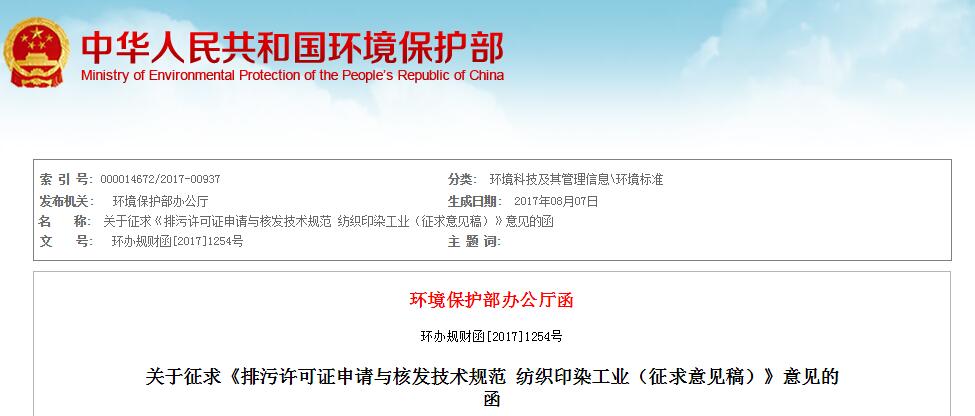 為落實(shí)《國(guó)務(wù)院辦公廳關(guān)于印發(fā)控制污染物排放許可制實(shí)施方案的通知》(國(guó)辦發(fā)〔2016〕81號(hào)),加快建立和完善覆蓋所有固定污染源的企事業(yè)單位控制污染物排放許可制,我部決定制定《排污許可證申請(qǐng)與核發(fā)技術(shù)規(guī)范紡織印染工業(yè)》國(guó)家環(huán)境保護(hù)標(biāo)準(zhǔn)。目前,標(biāo)準(zhǔn)編制單位已編制完成標(biāo)準(zhǔn)的征求意見稿。根據(jù)國(guó)家環(huán)境保護(hù)標(biāo)準(zhǔn)制修訂工作管理規(guī)定,現(xiàn)就該標(biāo)準(zhǔn)征求你單位意見,請(qǐng)于2017年9月7日前通過(guò)信函或電子郵件的方式將書面意見反饋我部。逾期未反饋的,將按無(wú)意見處理。標(biāo)準(zhǔn)征求意見稿及其編制說(shuō)明可登錄我部網(wǎng)站(http://www.zhb.gov.cn/)“意見征集”欄目檢索查閱,同時(shí),也可登錄國(guó)家排污許可申請(qǐng)系統(tǒng)(http://121.40.139.218:8081/permitExtGT/outside/default.jsp)進(jìn)行企業(yè)排污許可證申請(qǐng)?jiān)囂顖?bào)。