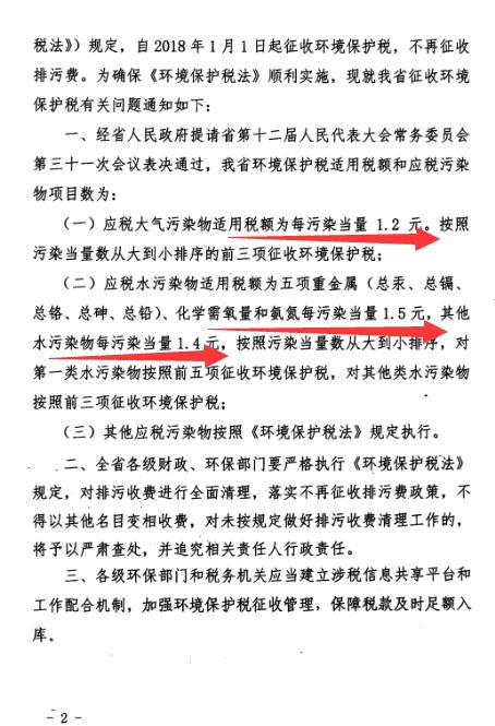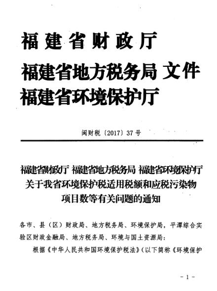 福建省印發(fā)關(guān)于我省環(huán)境保護稅適用稅額和應稅污染物項目數(shù)等有關(guān)問題的通知(閩財稅【2017】37號)。福建大氣污染物每污染當量1.2元;水污染物中,五項重金屬、化學需氧量和氨氮每污染當量1.5元,其他水污染物每污染當量1.4元。基本遵循“稅費平移”。