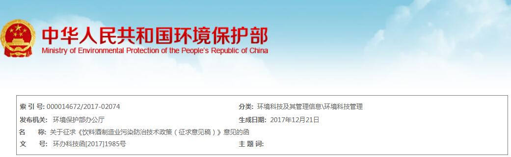 關(guān)于征求《飲料酒制造業(yè)污染防治技術(shù)政策(征求意見稿)》意見的函