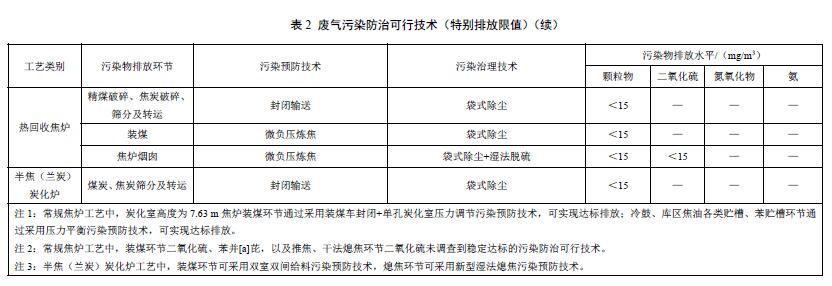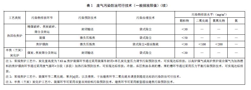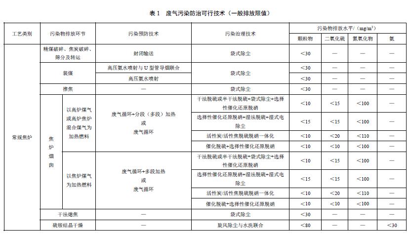 一般可達到GB16171新建企業(yè)大氣污染物排放濃度限值(一般排放限值)和大氣污染物特別排放限值(特別排放限值)的廢氣污染防治可行技術分別見表1和表2。